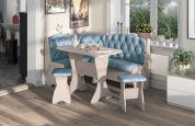 Набор мебели для кухни с классической красивой каретной стяжкой, включающий в себя угловую скамью, стол и два табурета. В угловой скамье под сиденьями расположены два ящика. Каркас выполнен из ЛДСП. Покрытие верхней части столешницы стола - термостойкий пластик, кромка ПВХ – 1 мм. Углы столешницы закруглены для избегания травмирования и придания лучшего эстетического вида.