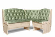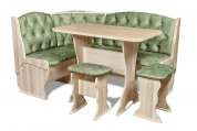 Набор мебели для кухни с классической красивой каретной стяжкой, включающий в себя угловую скамью, стол и два табурета. В угловой скамье под сиденьями расположены два ящика. Каркас выполнен из ЛДСП. Покрытие верхней части столешницы стола - термостойкий пластик, кромка ПВХ – 1 мм. Углы столешницы закруглены для избегания травмирования и придания лучшего эстетического вида.