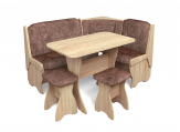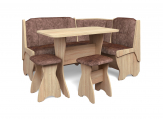 Набор мебели для кухни, включающий в себя угловую скамью, стол и два табурета. В угловой скамье под сиденьями расположены два ящика. Каркас ЛДСП. Покрытие верхней части столешницы стола - термостойкий пластик, кромка ПВХ - 1мм. Углы столешницы закруглены для избегания травмирования и придания лучшего эстетического вида.