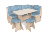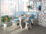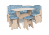 Набор мебели для кухни, включающий в себя угловую скамью, стол и два табурета. В угловой скамье под сиденьями расположены два ящика. Каркас ЛДСП. Покрытие верхней части столешницы стола - термостойкий пластик, кромка ПВХ - 1мм. Углы столешницы закруглены для избегания травмирования и придания лучшего эстетического вида.