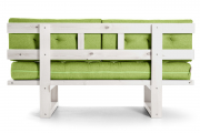 Каркас изделия выполнен из натурального и экологически чистого массива сосны. В комплекте две приспинные формовые подушки. Основанием служит реечное дно из массива сосны. На кушетке могут расположиться два взрослых человека, вес каждого до 140 кг. Данная мебель предназначена для закрытых помещений или веранд с крышей, прямой солнечный свет и дождь ей противопоказаны. Чехол не съемный.