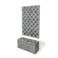 Прихожая «Мишель 950» создаст неповторимый интерьер в прихожей комнате. Обивка -качественный велюр. Вешалка снабжена четырьмя рожковыми крючками для одежды. В основе конструкции плита МДФ толщиной 10 мм., наполнитель ППУ. Пуф с мягким сиденьем и ящиком для хранения. Каркас из ЛДСП толщиной 16 мм., наполнитель ППУ.