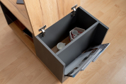 Журнальный столик «Crown (Кровн)» на колесиках отличается необычной формой и станет прекрасным дополнением к мебели в Вашей гостиной. Колесная опора позволит менять положение столика в комнате. Открытые ниши пригодятся для хранения книг, журналов, пульта и других вещей. Боковая ниша с карманом пригодится для хранения не только газет и журналов, но и вместит планшет, ноутбук и другую тонкую технику. Журнальный стол также имеет откидную сервировочную столешницу, которая станет Вашем помощником при сборе членов семьи вместе или приеме гостей. Полка из тонированного стекла дополняет и украшает данный модуль.